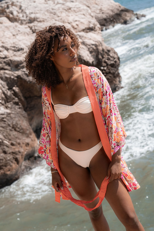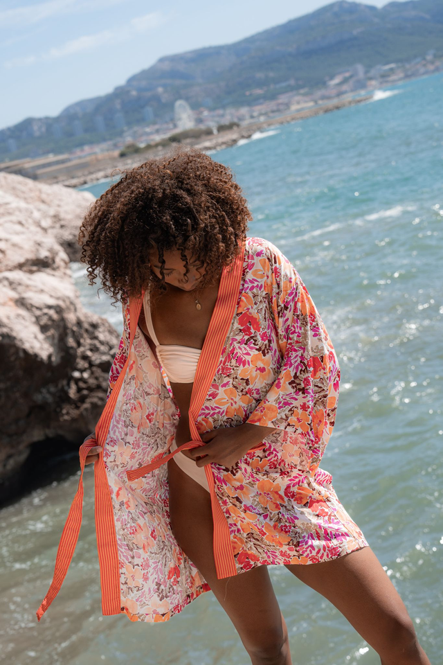Son tissu : 100% viscose, cette fibre est issue d'une matière naturelle transformée. Elle est considérée comme de la soie artificielle, elle est douce et soyeuse, légère et fluide, ce qui confère un tombé souple, qui s'adapte au corps. Son encolure et sa ceinture sont en soie.