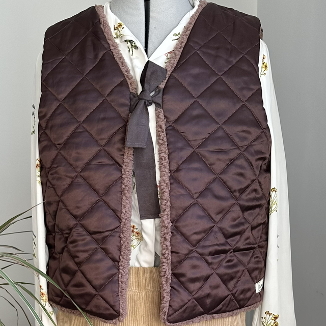 Pour cet hiver, mettez vous au chaud avec cette doudoune douillette sans manches et réversible, un côté matelassé brique et l'autre côté est en fausse fourrure chocolat.