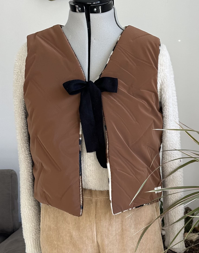 Sa conception réversible offre deux styles en un seul vêtement, pour varier les silhouettes avec liberté. La fermeture par liens à nouer souligne délicatement la taille et apporte une signature féminine inspirée de l’esprit couture. Légère, confortable et enveloppante, cette veste matelassée sans manches se porte facilement en toute saison.